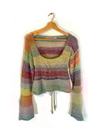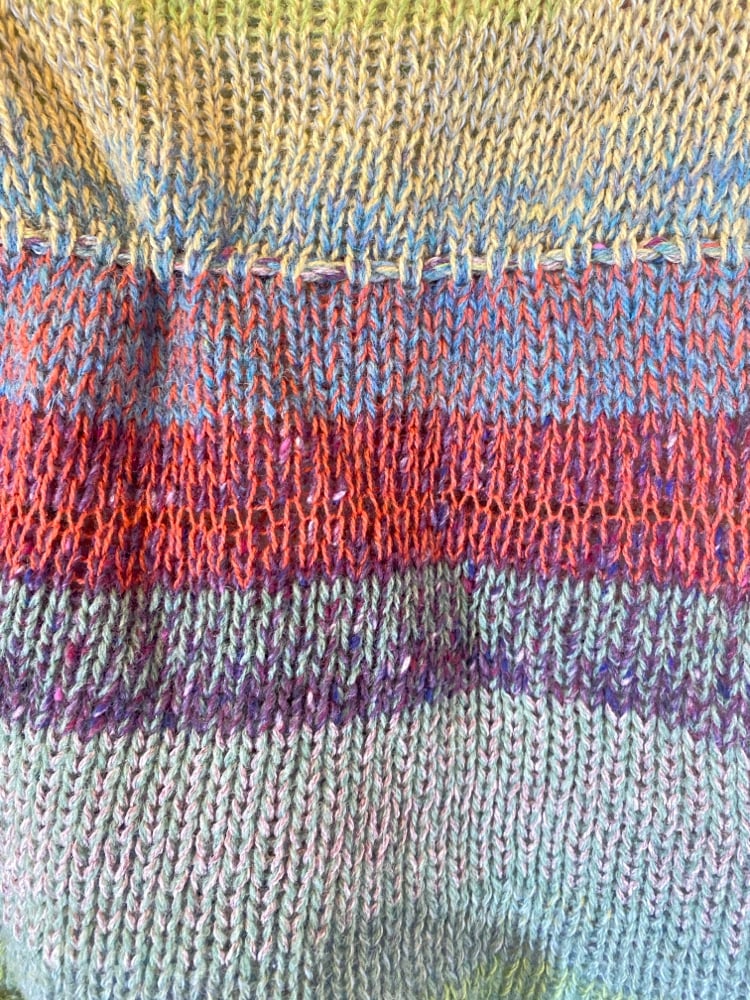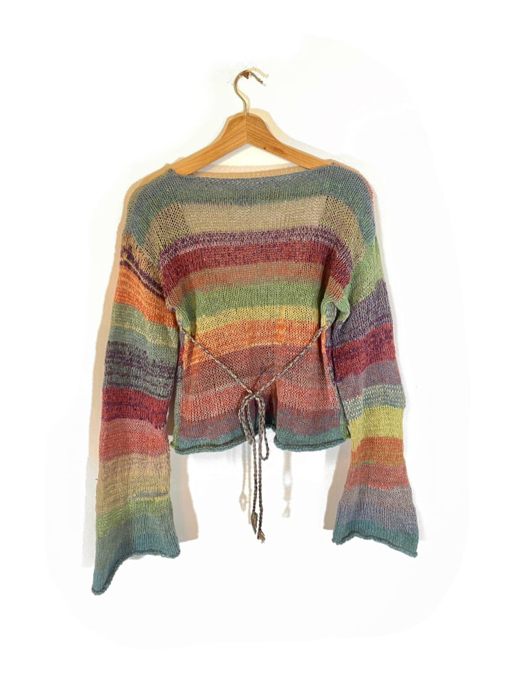This top is made from lots of cones of yarn from different fibres. I just love this colour combo and decided to make a piece incorporating all of them. It’s got a tie too so you can gather it in around the waist. The sleeves are a loose fit with a low neckline, it is somewhat see through just as a heads up :) Named after the artist caroline who I’ve been listening to a lot recently