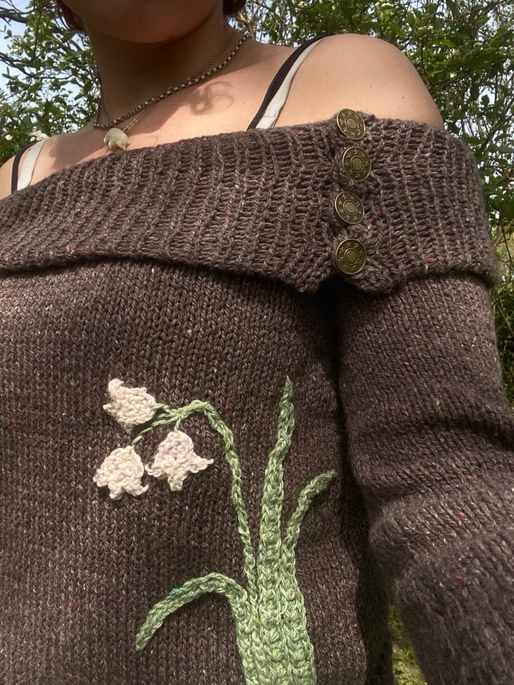 Made from 100% recycled tweed mixed fibres yarn including wool with an appliquéd Spanish Whitebell 🐚🐚🐚🐚