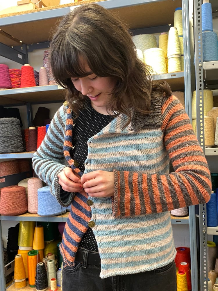 It’s got jean style star buttons running all the way down a side seam. I decided to make every panel a different colour combo, and it’s got little speckles like the traditional tweed. It’s soft and can be worn in multiple ways. It also has fully-fashioned seams which shape the shoulders like a raglan style knit. The collar can also be incorporated into the top button which looks cool !